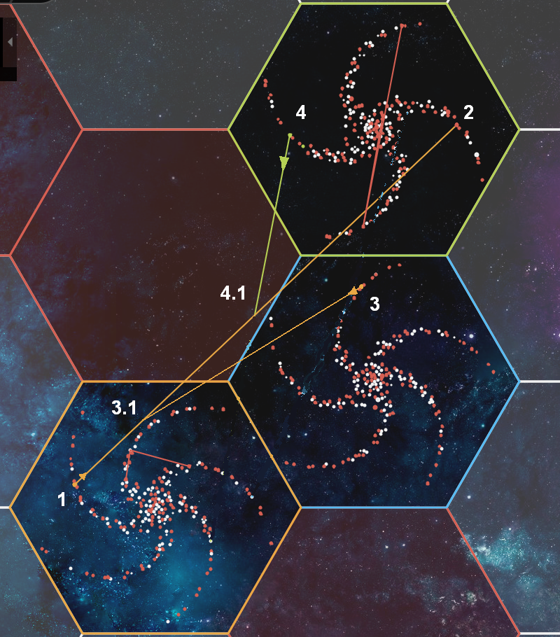 Например, ситуация: нужна помощь в зачистке планеты в точке 2. Связываюсь с союзниками, называю планету, они подтверждают готовность и уточняют сколько времени у них до нее лететь флоту. Дальше у игрока из альянса, он запускает флот. Его значок и траектория появляются на карте. Я и игрок из синего гекса отправляем флоты на соединение. Где-то в точках 3.1 и 4.1 флоты соединяются и дальше уже летят кучей и сразу сносят за раунд цель. Разлетаются из точки по домам. Времени потрачено минимум.