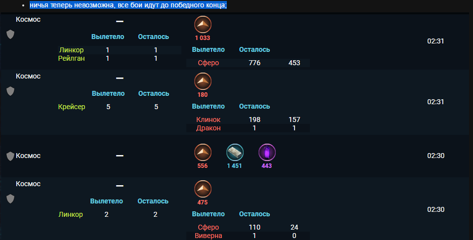 Насколько могу понять, в космических боях периодически происходит ничья, которой судя по описанию патча не должно быть. Собственно: