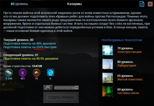 Так же и тут, "подготовка пехоты <происходит> на 233% быстрее". Ясно что это не нарушение причинности и пехота не будет готова раньше, чем нажал. Но как-то кривишься.