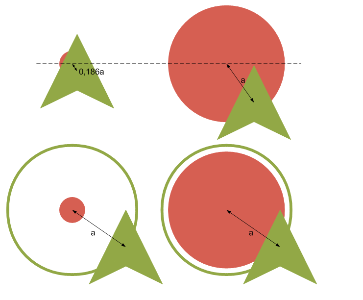 Предлагаю немного изменить сам значок планеты с флотом на орбите. Если мы увеличим существующие значки для самой малой и самой большой планеты, то заметим, что расстояния между геометрическими центрами самих планет и треугольников-флотов у планет малого и большого размера различаются более чем в 5 раз. Предлагаю несколько сдвинуть сам значок флота в сторону так, чтобы его геометрический центр оказался за пределами окружности планеты и провести через него окружность-орбиту (одного с флотом цвета). Кроме того, расстояние между центрами фигур должно быть постоянным и не зависящим от размеров окружности планеты.