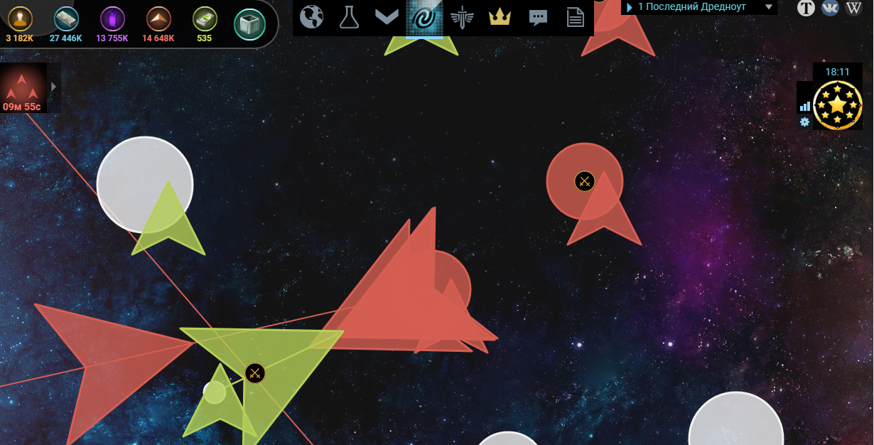 В данном случае мы наблюдаем 6 (два перекрыли друг друга) флотов идущих на одну планету И один отправившийся на соседнюю.