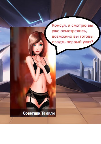 Консул появляется в стартовой локации Жилой Район, ему показывается кат-сцена, в которой к нему обращается Тамили, думаю тут ФШМ требуется добавить ей немного анимации, позы, минимальная мимика, жестикуляция при диалоге* при каждом новом предложении, что-то меняется. (В дальнейшем так же поступить с прочими персонажами, думаю отлично подойдут те или иные сцены из комиксов). Естественно во время кат-сцен играет фирменная музыка Антона Брежнева