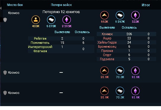 Основная проблема, в том что из-за некой ошибки, я потерял 9 пожинателей, 2 рейлгана и 1 флаг. Восстановить их овер 10кк металла 5кк кристалов и почти лям крестьян. 720+120к а это еще 10кк металла или 3кк кристалла. Получил я за эту ошибку чуть меньше 2кк металла и 500к кристаллов. Итого - 18кк металла и 5кк крисов (или 8кк металла и 8кк кристаллов) Если смысл играть дальше? Одно дело когда теряешь по своей глупости, а другое странным обстоятельствам. Если бы я потерял 1-2 пожинателя даже по системной ошибке это было не критично, я бы нафармил за пару дней остановив производство.