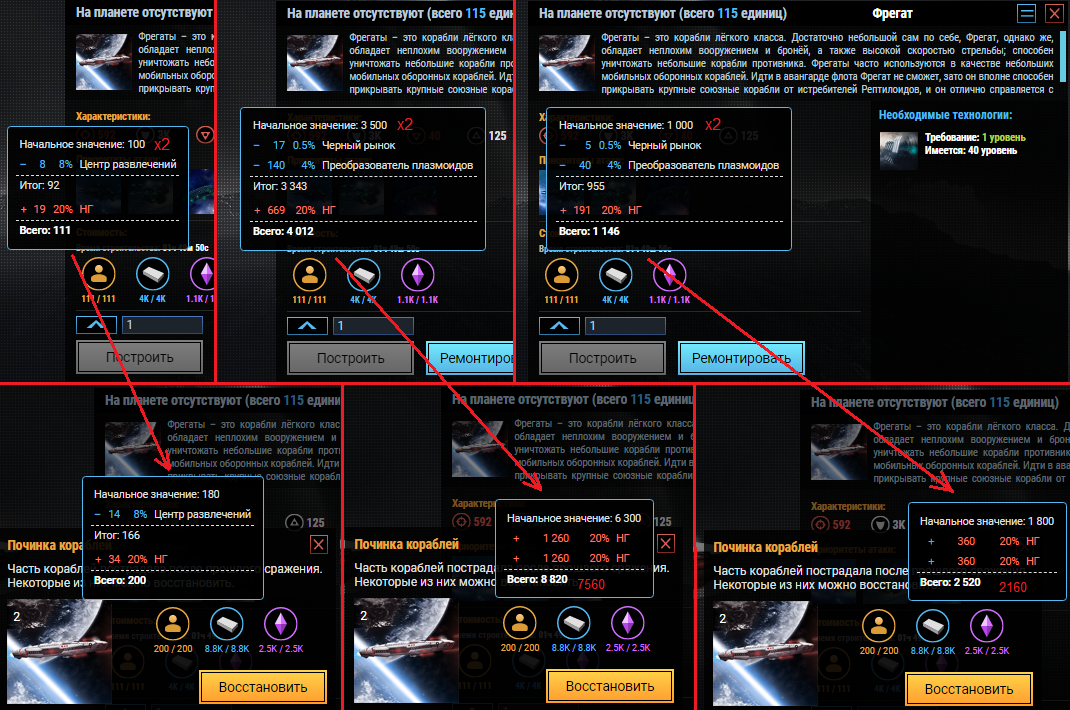 В целом аналогично зданиям/исследованиям: до 4-х бонусов, Мнг отдельным уровнем внизу.