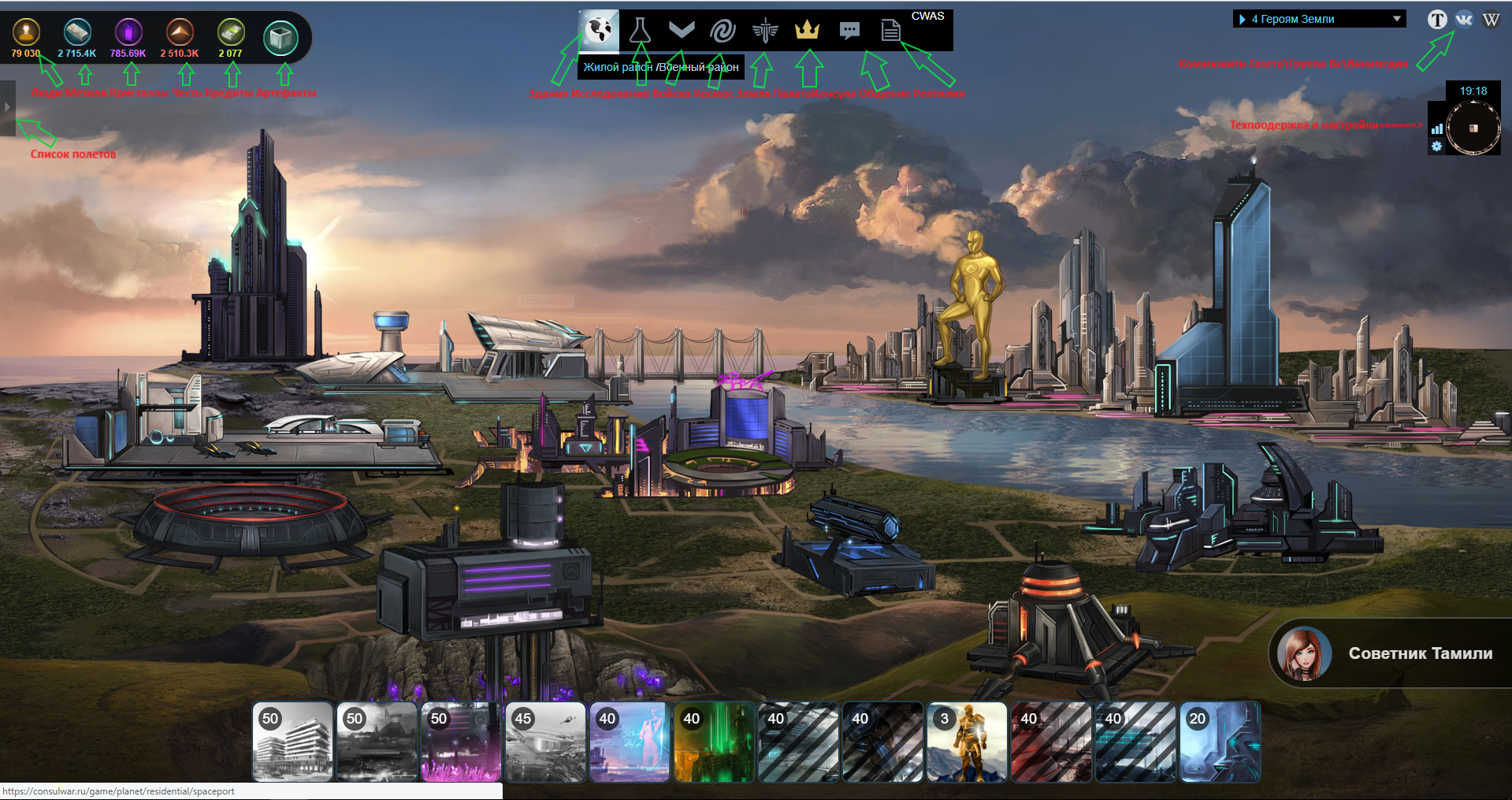 Сверху в центре находятся переключатели для разных страниц вашей колонии, в правом верхнем углу – кнопка для перехода в техподдержку и настройки интерфейса , а также ссылки на сообщества и игровую википедию. Еще там можно включить музыку  и посмотреть статистику других Консулов с помощью кнопки .