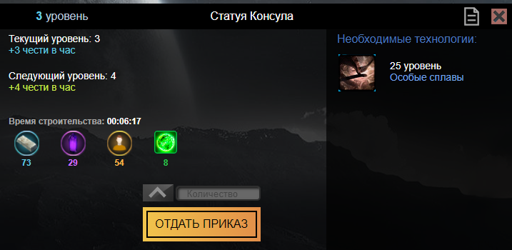 Например, для постройки статуи консула от 1 по 20 уровень нужно исследовать особые сплавы 25 уровня.