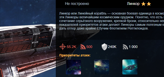 Каждый юнит, как консульский, так и рептилоидный, имеет список приоритетных целей, указанных на его странице. К примеру, в приоритетах консульского Линкора (см.картинку внизу) находятся Броненосец, Хайль-Гидра и Дракон. Это значит, что при наличии этих кораблей во флоте противника, Броненосец получит 40% урона, наносимого Линкором, Хайль-Гидра – 30%, а Дракон – 20%. Оставшиеся 10% равномерно распределятся по всем кораблям во флоте противника. Если какого-то корабля из списка приоритетов нет в противостоящей вам армаде рептилий, соответствующий процент также делится на все цели равномерно.